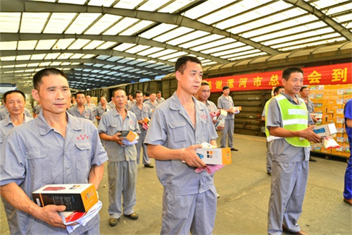 7月24日上午,烈日當頭,漯河市總工會黨組書記、常務副主席吳花蕾,市總工會副主席張煒一行在雙匯集團工會主席劉清德陪同下來到雙匯儲運公司慰問一線員工,為他們送去了飲水杯、毛巾、白糖、葡萄糖飲料等防暑用品,炎炎夏日里給廣大員工送去絲絲清涼。