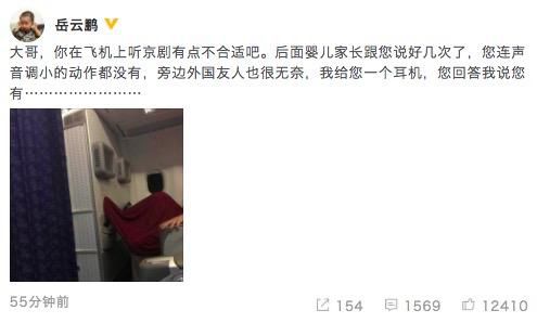 3月7日晚,岳云鵬通過微博譴責(zé)飛機(jī)上不文明現(xiàn)象,寫道:“大哥,你在飛機(jī)上聽京劇有點(diǎn)不合適吧。后面嬰兒家長跟您說好幾次了,您連聲音調(diào)小的動作都沒有,旁邊外國友人也很無奈,我給您一個耳機(jī),您回答我說您有……”