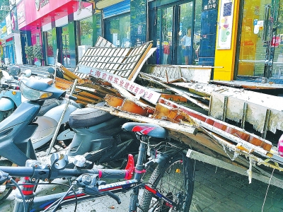 本報(bào)訊8月5日下午1時(shí)40分左右,鄭州市民李女士逛過(guò)大學(xué)路一家沿街服裝店,轉(zhuǎn)身剛剛離去,只聽見轟的一聲巨響,店鋪的門頭招牌墜落。約20平方米的門頭招牌,砸中了店前幾輛電動(dòng)車,幸未殃及行人。