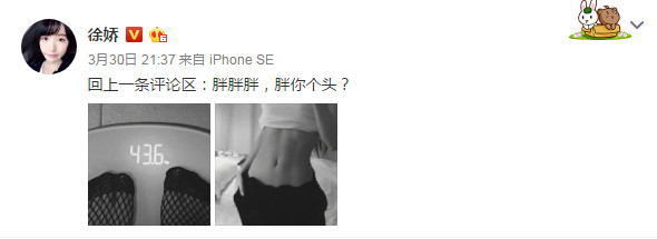 徐嬌30日早上在微博貼出全身照,照片中,只見她側(cè)綁馬尾辮,穿著深色襯衫,搭配淺色及膝裙,腹部突起的部分明顯是布料褶皺,怎料卻引來(lái)網(wǎng)友吐槽“最近伙食不錯(cuò)啊”、“看起來(lái)像懷孕了”、“嬌嬌胖了”等字眼,不到1天時(shí)間,終于看不下去,親自再發(fā)2張照片嗆聲網(wǎng)友!