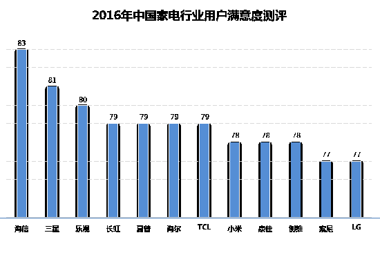 2017年1月3日,由中國(guó)質(zhì)量協(xié)會(huì)、全國(guó)用戶委員會(huì)組織開(kāi)展的2016年中國(guó)家電行業(yè)用戶滿意度測(cè)評(píng)結(jié)果正式出爐:在電視類(lèi)產(chǎn)品的用戶滿意度測(cè)評(píng)中,海信以83分高居第一,其次是三星、樂(lè)視TV、長(zhǎng)虹、夏普。