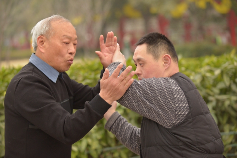 談起和周遠(yuǎn)的結(jié)緣,聶玉璽如數(shù)家珍。4年前,聶玉璽在鄭州人民公園練拳。一個(gè)小伙子站在旁邊目不轉(zhuǎn)睛地看。經(jīng)過(guò)了解,聶玉璽得知,周遠(yuǎn),38歲,因小時(shí)候有病,反應(yīng)遲鈍,有自閉傾向,不愛與人交流,很少有人愿意教他。周遠(yuǎn)的父母說(shuō)起兒子就掉淚。