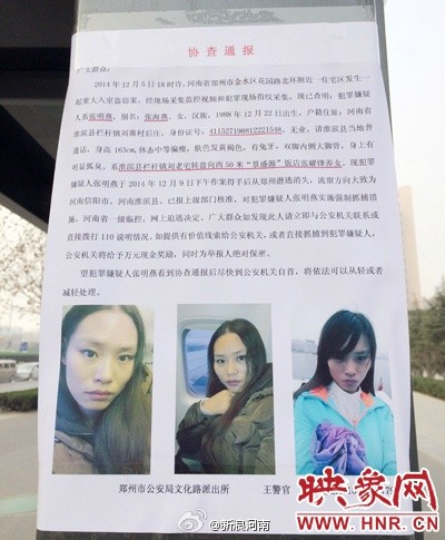 2014年12月5日,鄭州花園路北環(huán)附近一住宅區(qū)發(fā)生一起重大入室盜竊案,嫌疑人盜竊20余萬元財物后潛逃?,F(xiàn)查明:犯罪嫌疑人張明燕,女,26歲,有兔牙,身上有明顯狐臭。警方發(fā)布協(xié)查通報,懸賞萬元緝拿。管你是誰,轉(zhuǎn)發(fā),幫警方追逃!