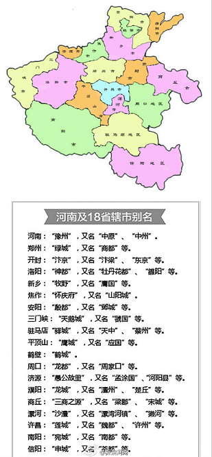 鄭州:綠城、商都。開封:汴梁、汴京、東京;洛陽:神都、牡丹花都;新鄉(xiāng):牧野、庸國;焦作:懷慶府、山陽城;安陽:殷都、鄴城;三門峽:天鵝城、虢國;駐馬店:驛城、天中;平頂山:鷹城、應(yīng)國;鶴壁:鶴城;周口:龍都;信陽:申城、茶都。