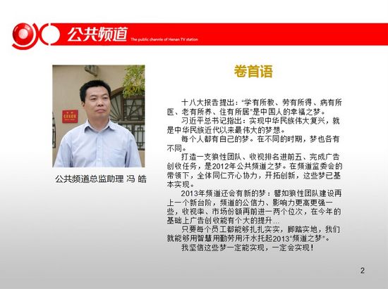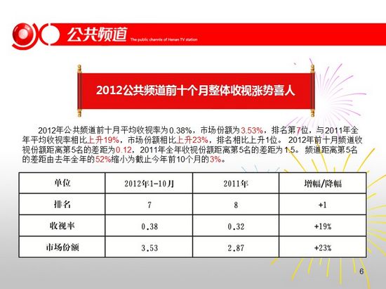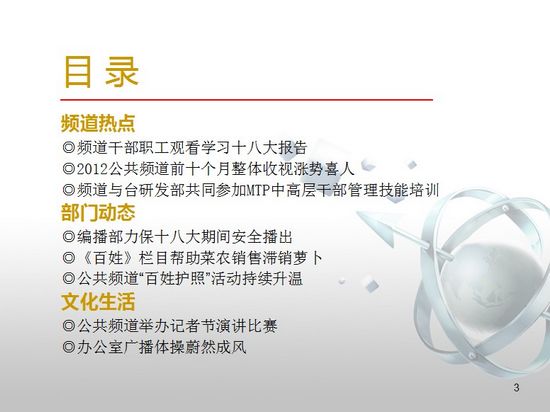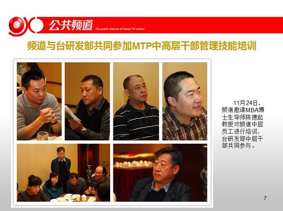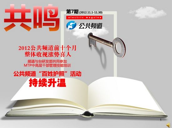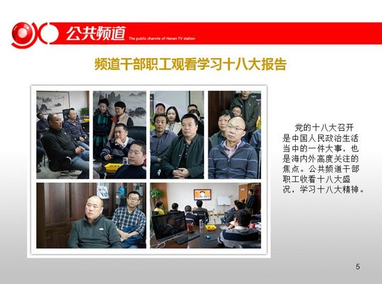 頻道干部職工觀看學(xué)習(xí)十八大報告,2012公共頻道前十個月整體收視漲勢喜人,頻道與臺研發(fā)部共同參加MTP中高層干部管理技能培訓(xùn)。