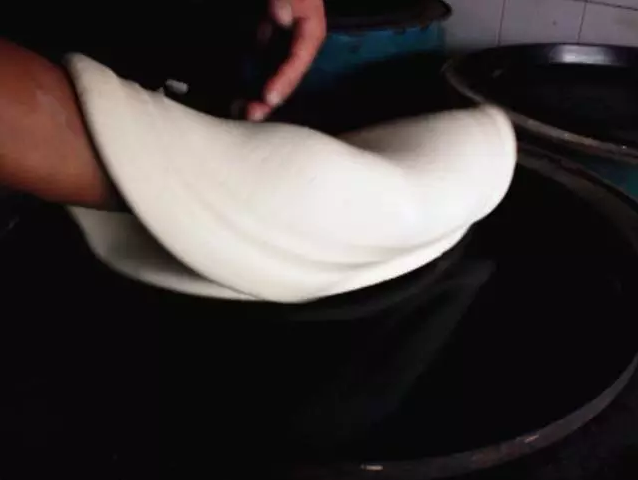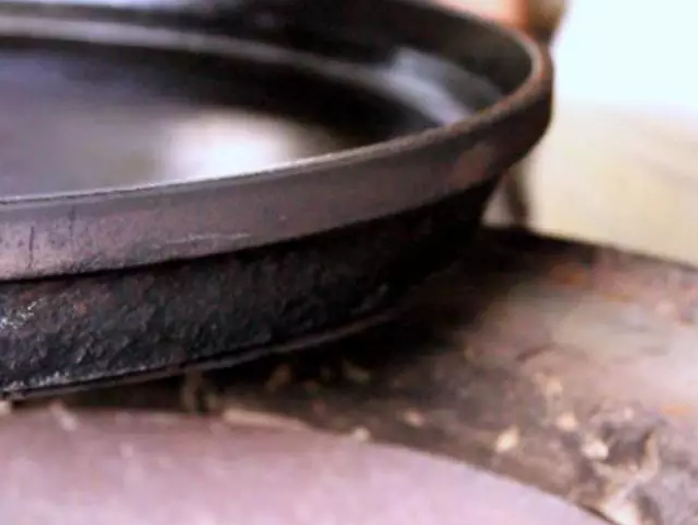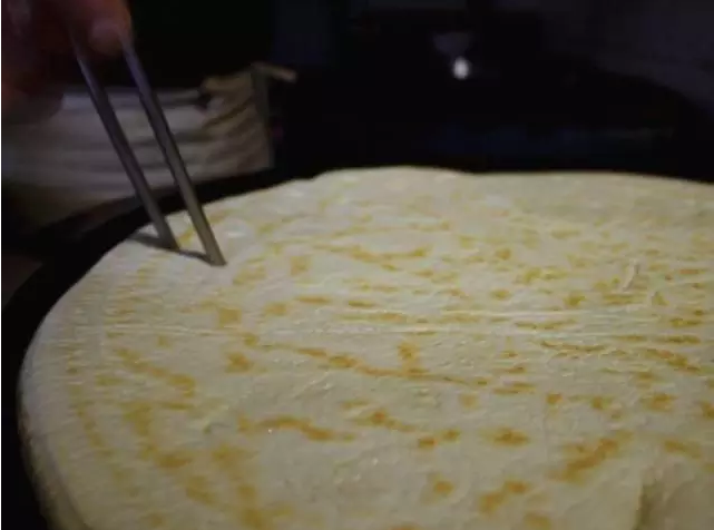 深藏不露的師傅要亮出絕招了,右手的食指和中指按在面皮上,左手按壓著右手迅速畫(huà)出圈來(lái),看似簡(jiǎn)單卻很考驗(yàn)師傅的功力,這個(gè)黝黑發(fā)亮的鏊子就是做鍋葵的神器,它不是常見(jiàn)的鐵鏊而是經(jīng)過(guò)特殊加工的,選用導(dǎo)熱快的銅和鐵摻在一起鑄成鏊子,鍋特別的沉底部也足足有三四公分厚呢。