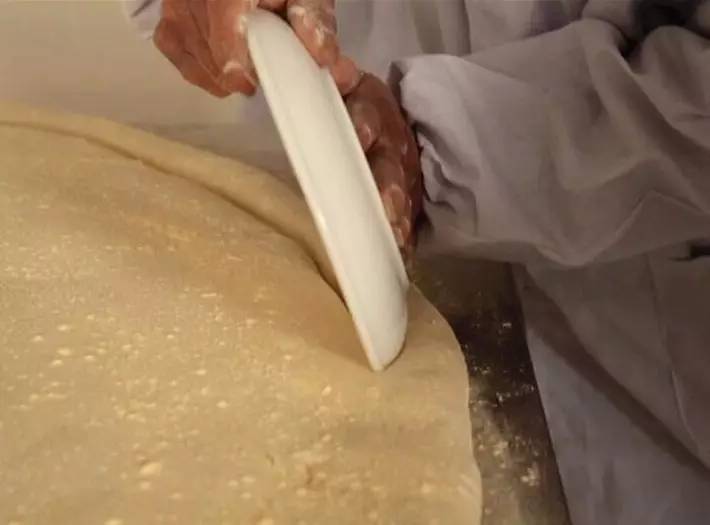 面團(tuán)下撒上細(xì)細(xì)的玉米面防止粘連,餳面2個(gè)小時(shí)再搟成圓餅狀。接下來的切面才是考驗(yàn)功夫的時(shí)候,老手藝人不是用刀竟然是用盤子。圓圓的盤子碾過面餅一周,切出來的面條粗細(xì)均勻,一招一式,純熟利落。據(jù)說能掌握這門手藝的人,現(xiàn)在在人主村也是屈指可數(shù)了。