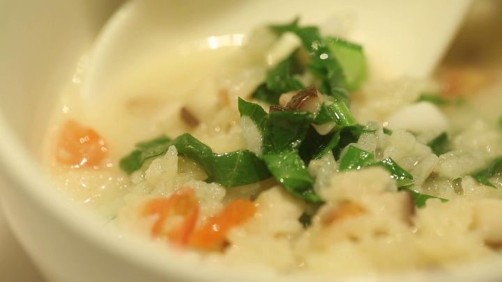 米粒提前炸過(guò),配著蝦仁、香菇、青菜和西紅柿丁,趁熱吃大米還有嘎嘣嘎嘣的脆響,要是不急就再泡上一會(huì)兒,米飯吸滿了湯汁就又是另一種軟糯的口感。