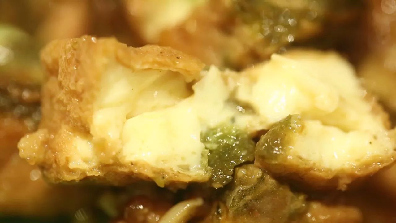 主廚研發(fā)的新式廣東菜——萬(wàn)怡黑豆腐,乍一看很像豆腐泡,咬開(kāi)卻是嫩滑的像布丁一樣的雞蛋豆腐。制作時(shí)還特意加入了海苔,也增添了幾分鮮香。肉末和高湯燒成醬汁裹在黑豆腐上,再配上入口即化的雞蛋豆腐,今天的晚飯穩(wěn)了!