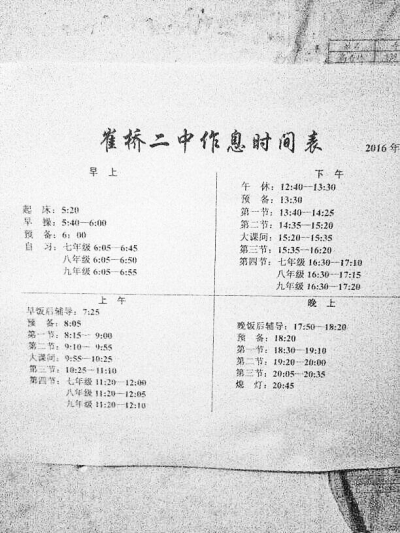 悲痛之余,佳佳的伯伯質(zhì)疑學(xué)校規(guī)定的作息時(shí)間存在不合理狀況。記者從其提供的該校作息時(shí)間表上看到,該校針對所有學(xué)生規(guī)定的早上起床時(shí)間是凌晨5時(shí)20分,早操是5時(shí)40分至6時(shí)整,然后是早自習(xí)。